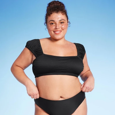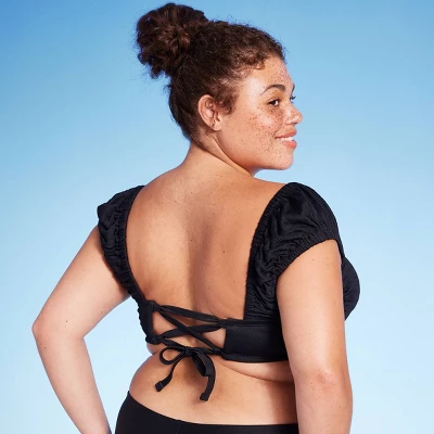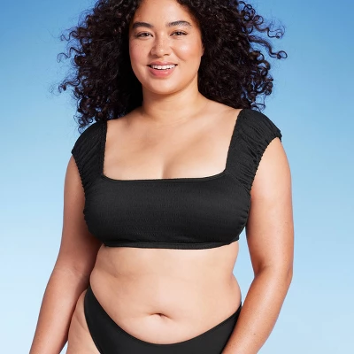 Smocked bralette bikini top from Wild Fable™ in a solid hue. Made from soft fabric with spandex and full lining for stretchy comfort in and out of the water. Removable cups offer customizable coverage. Designed with chic cap sleeves and a back tie closure.