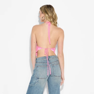 Crochet halter top from Wild Fable™ with a V-neckline and behind-the-neck halter strap. Tailored in a regular-fit silhouette with a mid-length hem. Made from midweight cotton fabric for breathable all-day wear. Back-tie closure completes the look and provides a customizable fit.