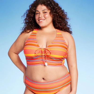 Ruched-front longline halter bikini top from Wild Fable™ with shell-tipped drawstring fastening. Made from soft fabric with spandex and full lining for flexible comfort in and out of the water. Removable cups offer customizable coverage. Finished with behind-the-neck ties for a customizable, stay-put fit.