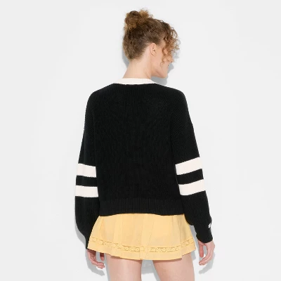 Shaker cardigan from Wild Fable™ in a solid shade with contrast-trimming accents. Features a V-neckline, full-length button-down front and long sleeves with dropped shoulders. Adorned with “Tailgate Club” typographic motif on the chest. Made from midweight cotton for all-day cool, breathable comfort. Tailored in a standard-fit silhouette with a mid-length hem and ribbed edges.