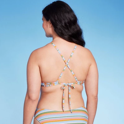 Bikini top from Wild Fable™ adorned with multicolor stripes and lurex. Made of soft fabric with a blend of metallic fiber and spandex. Features an underwire design with removable cups for customizable coverage. Slender shoulder straps make a crisscross design at the back and fasten for an adjustable fit.